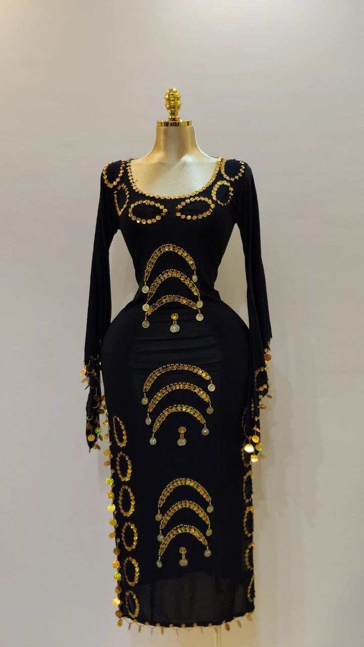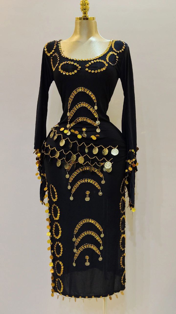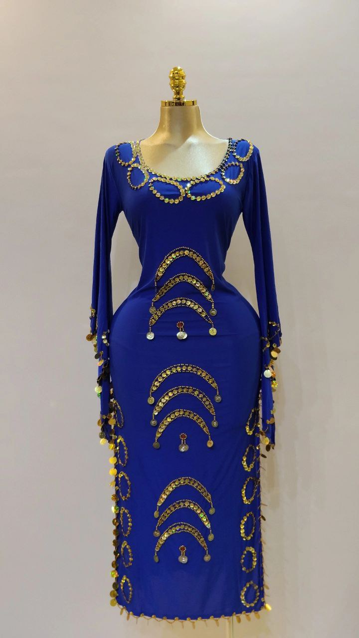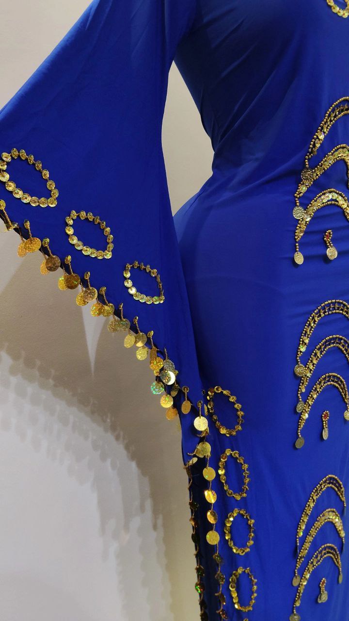 جلابية رقص بكم مصنوعة من الليكرا الناعمه مزينة بخرز وترتر مع حزام مزين بالكوينز الجولد لاكمال الاطلالة.