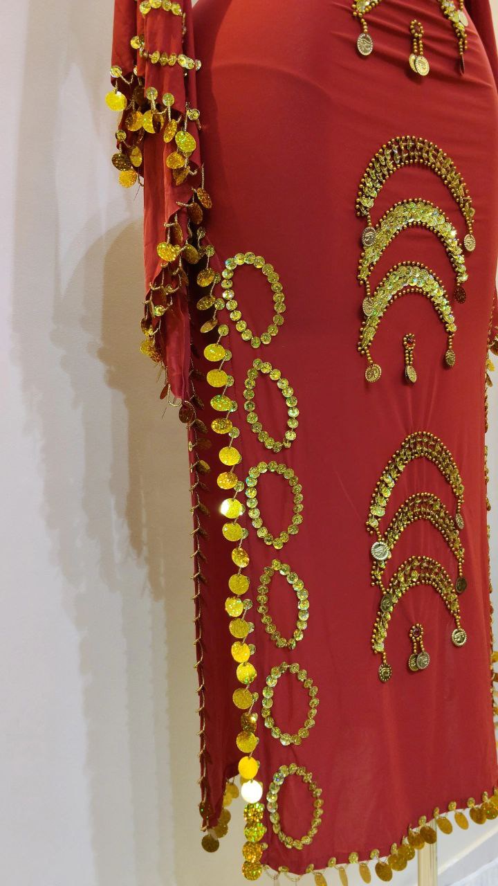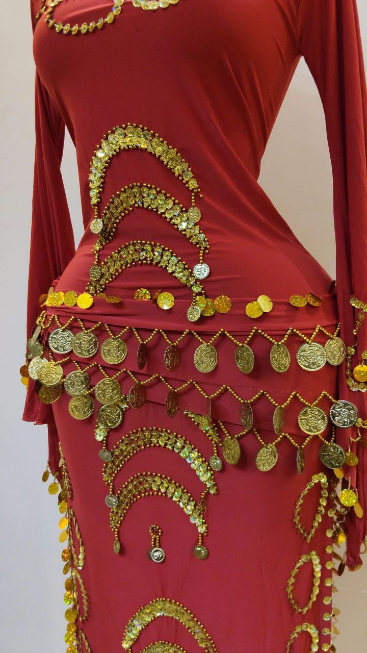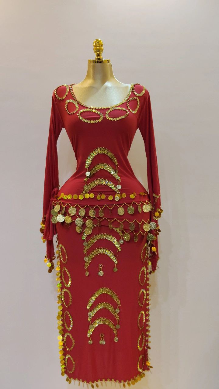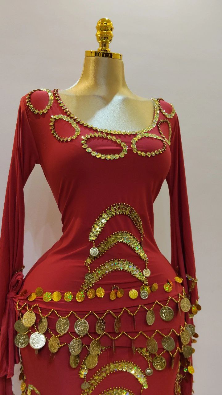 جلابية رقص بكم مصنوعة من الليكرا الناعمه مزينة بخرز وترتر مع حزام مزين بالكوينز الجولد لاكمال الاطلالة.