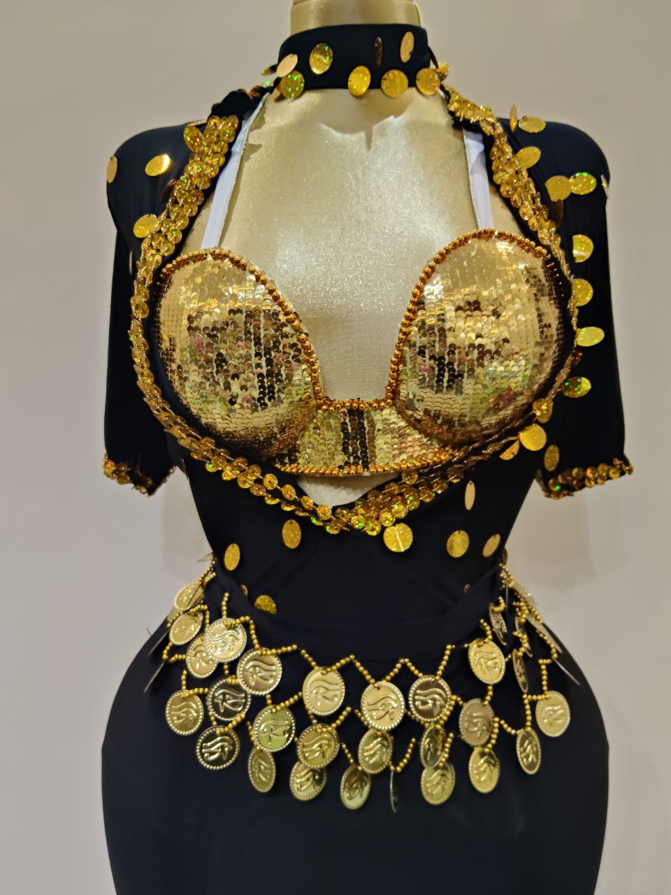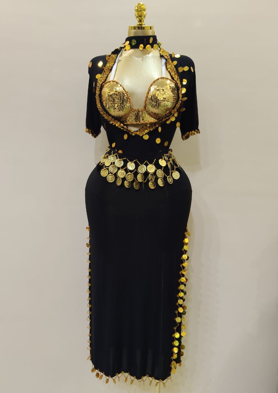 جلابية أميرة الدهب للرقص الشرقي بتصميم راقٍ يبرز الأنوثة والفخامة، مصنوعة من قماش ليكرا مريح. تأتي مع برا جولد هاند ميد، حزام مزين بالكوينز، وباندنا للشعر لإطلالة متكاملة.