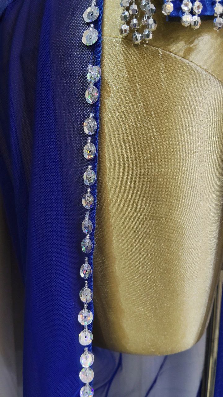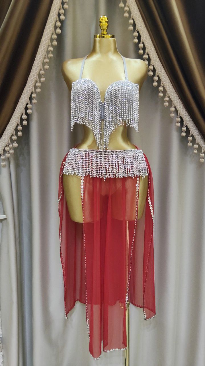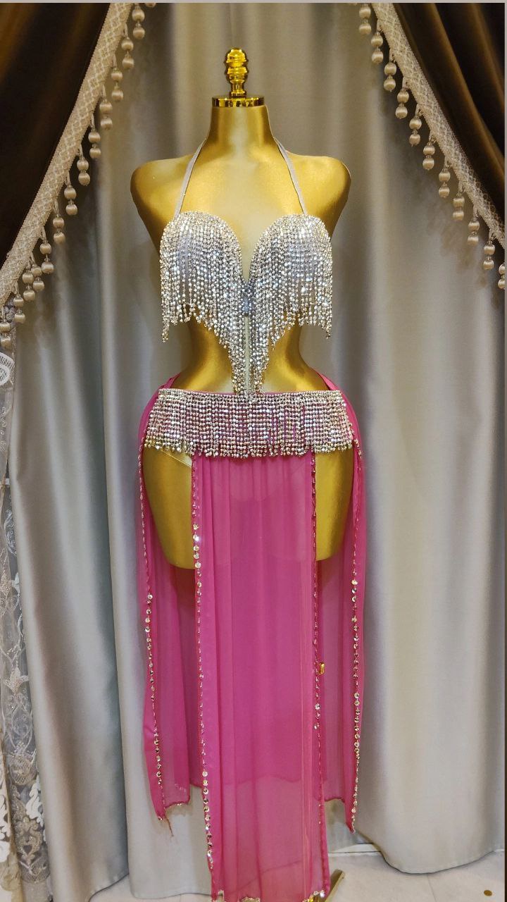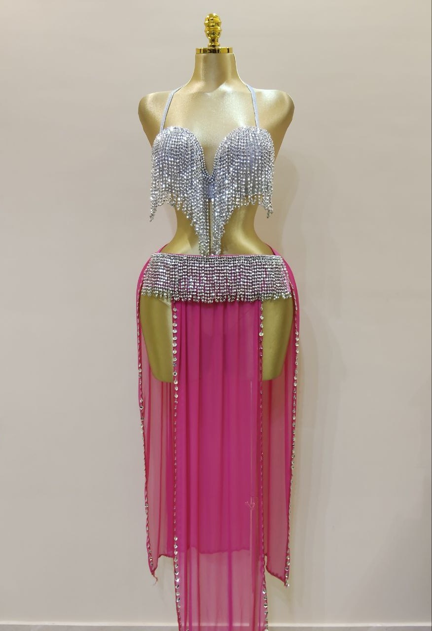 بدلة لؤاؤه للرقص الشرقي تصميم انيق بجيبه شيفون خفيفة.مزين بلآلئ ناعمه تضيف لمسه فخامه هادئة.