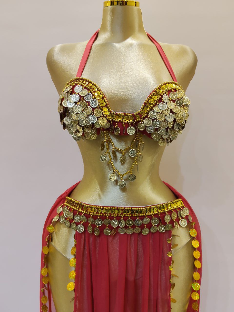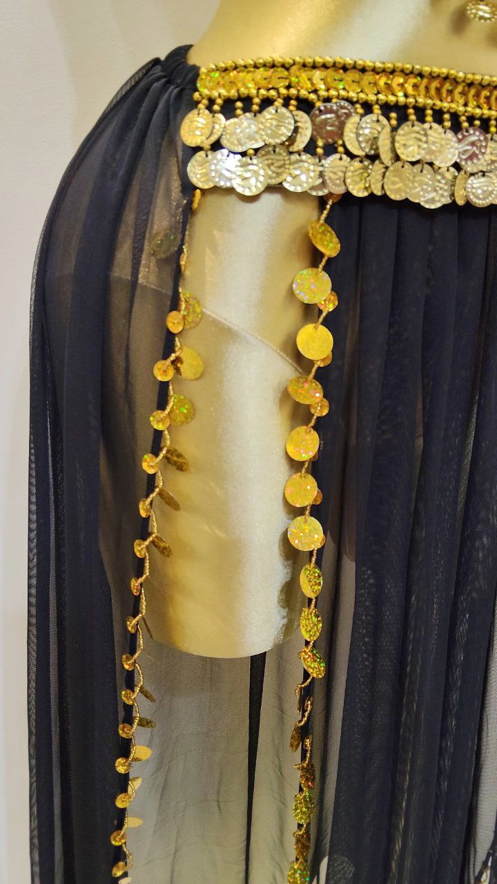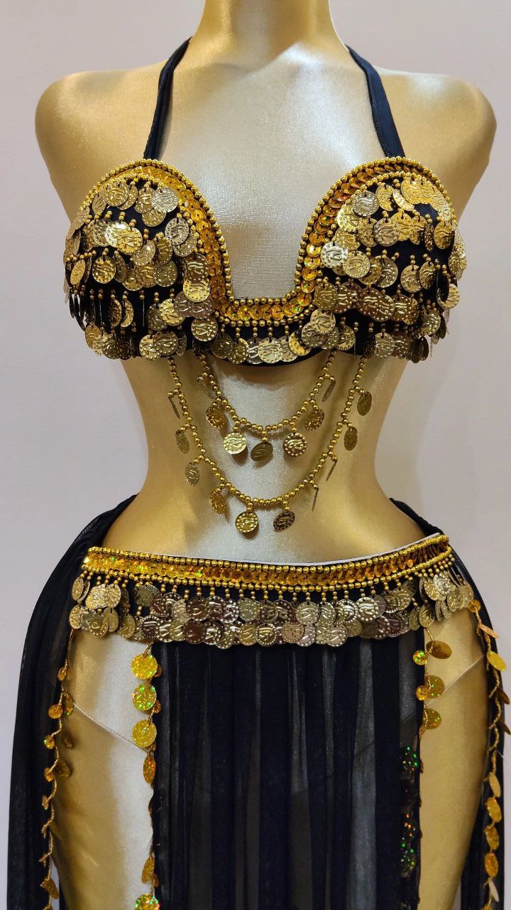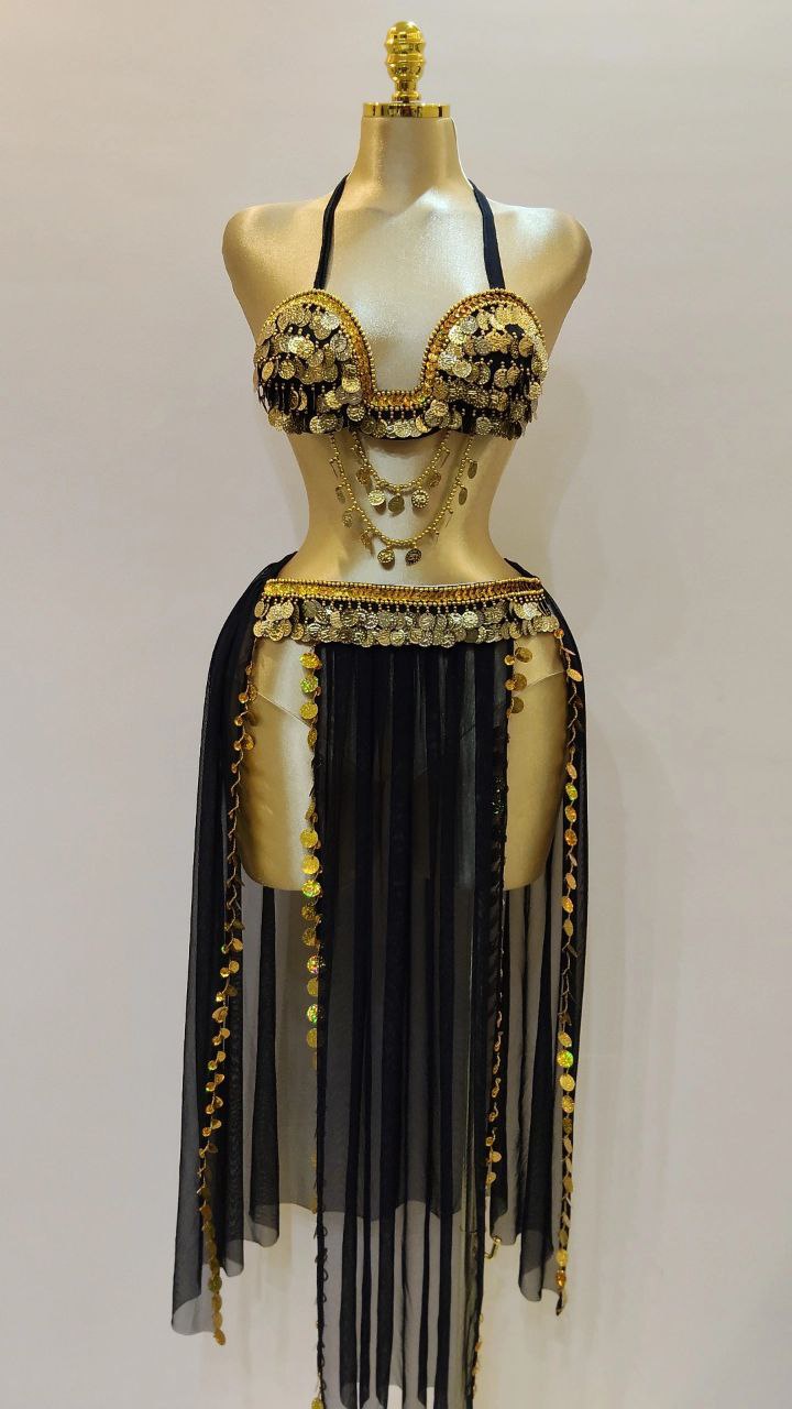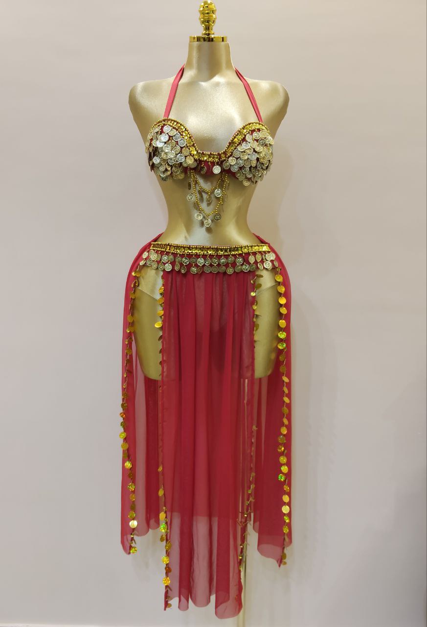 بدلة رنه للرقص الشرقي أنيقة وعصرية، مصنوعة من جيبة شيفون خفيفة مع برا مزين بالكوينز الذهبي لإطلالة مميزة ومتكاملة.