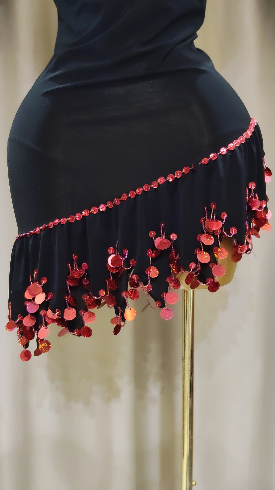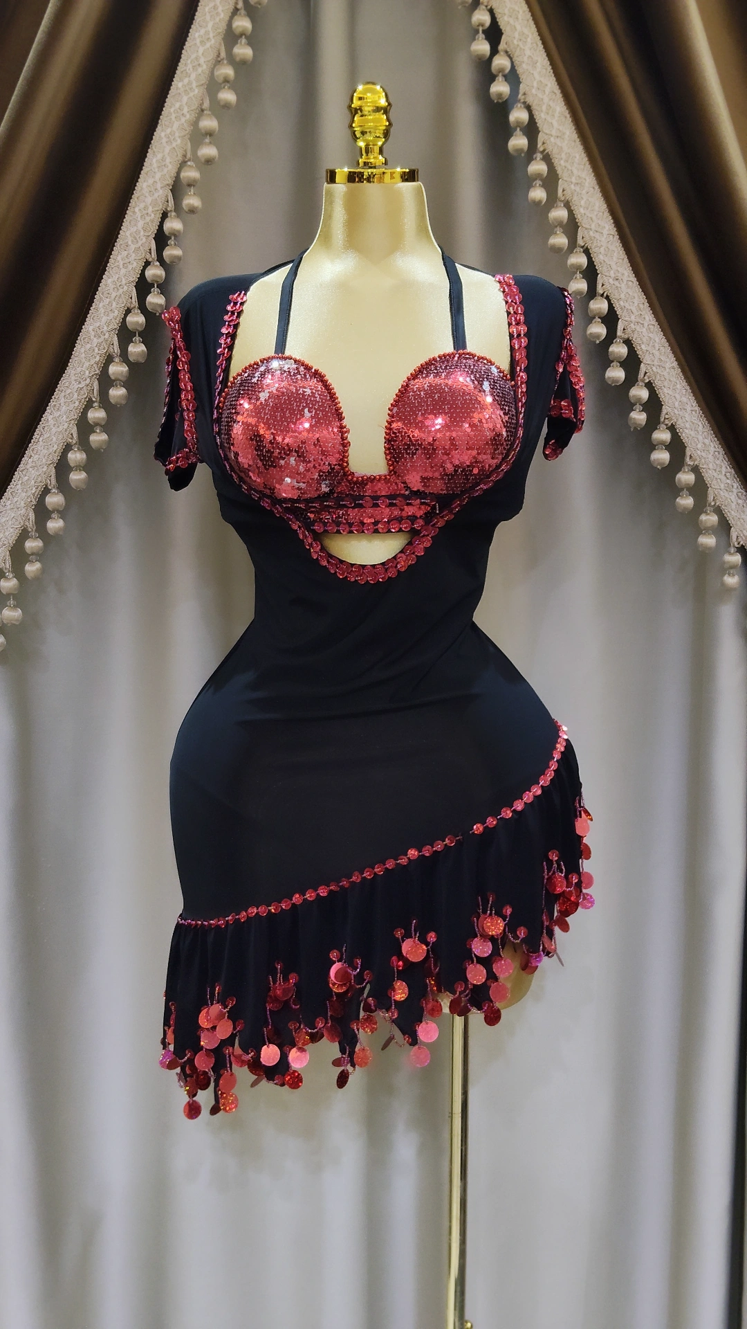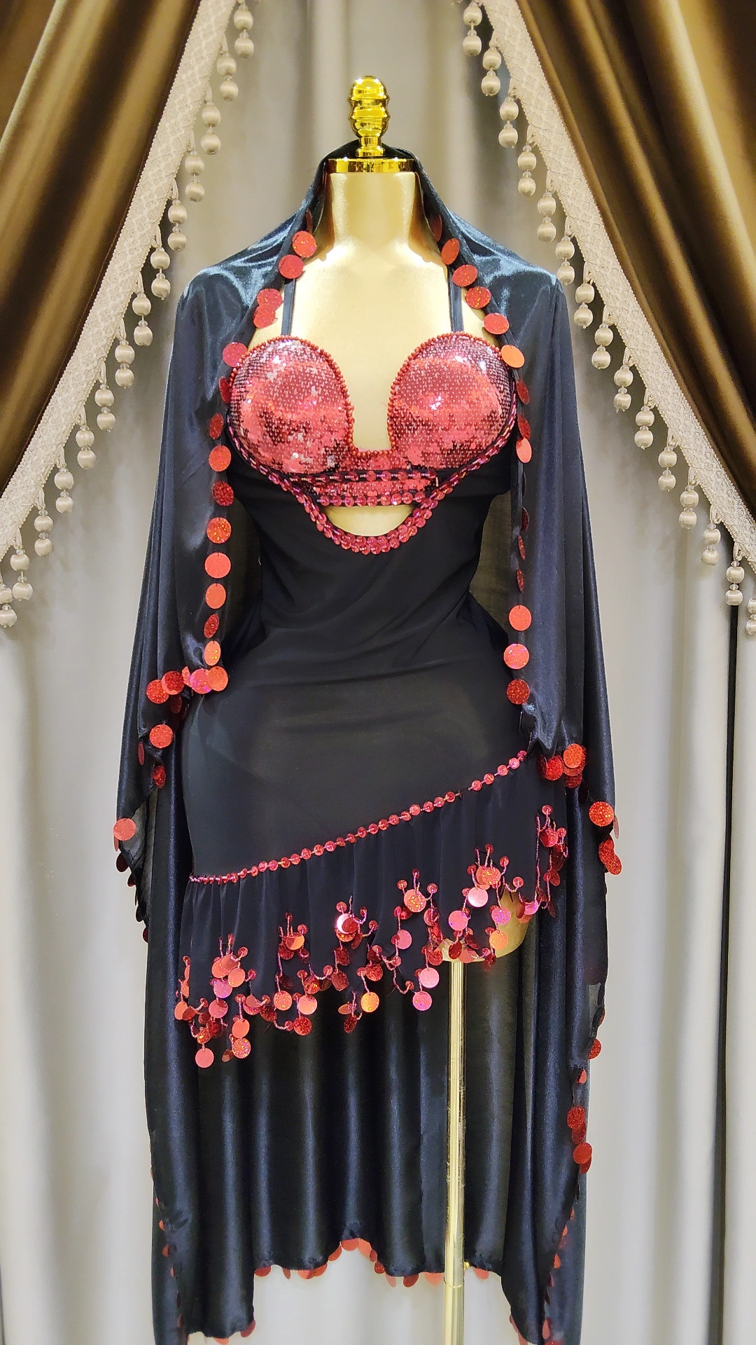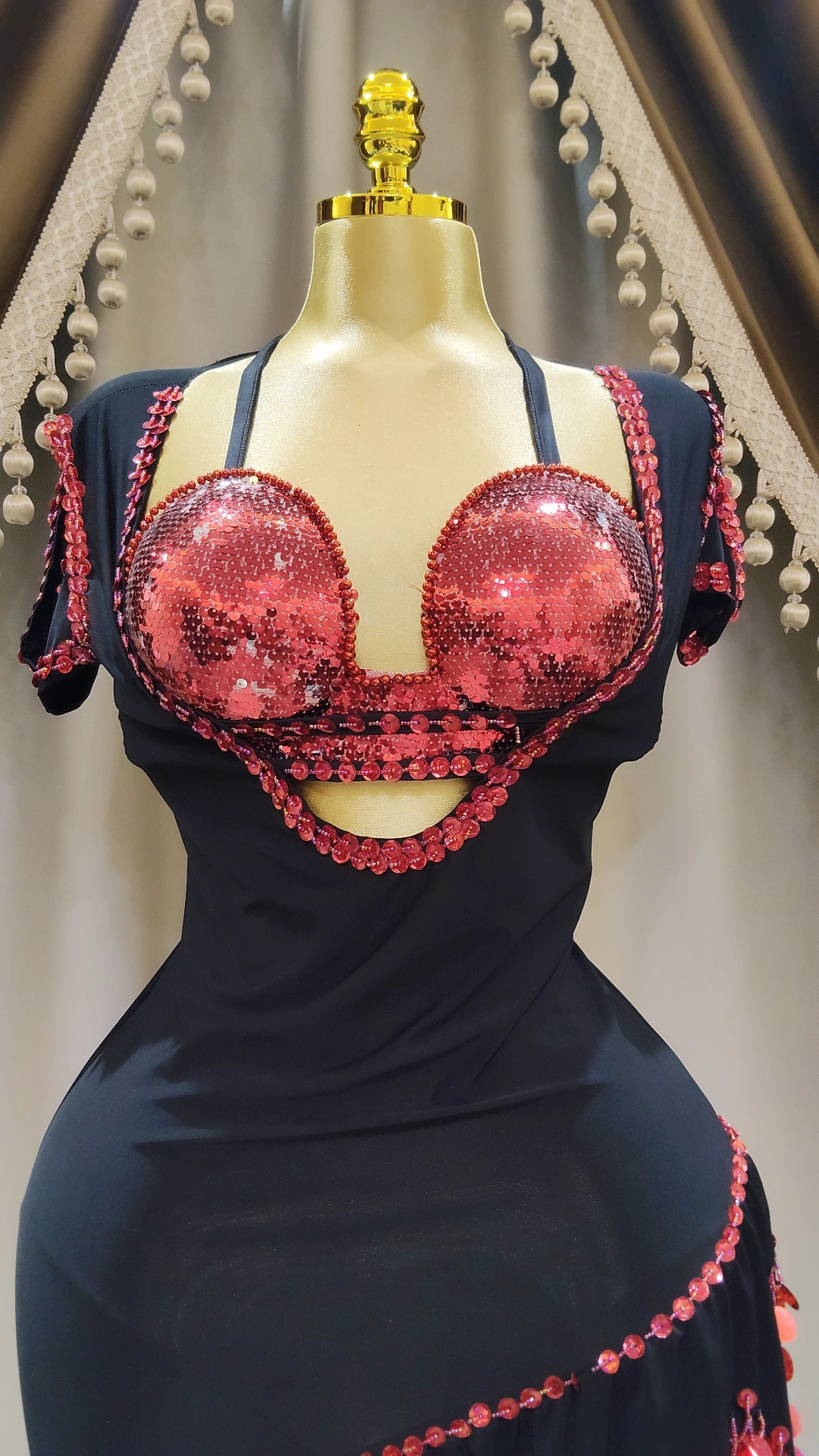 بدلة ليكرا مزينة بالخرز والترتر الاحمر مع كب عادي من الترتر و ملاية من الستان الناعم